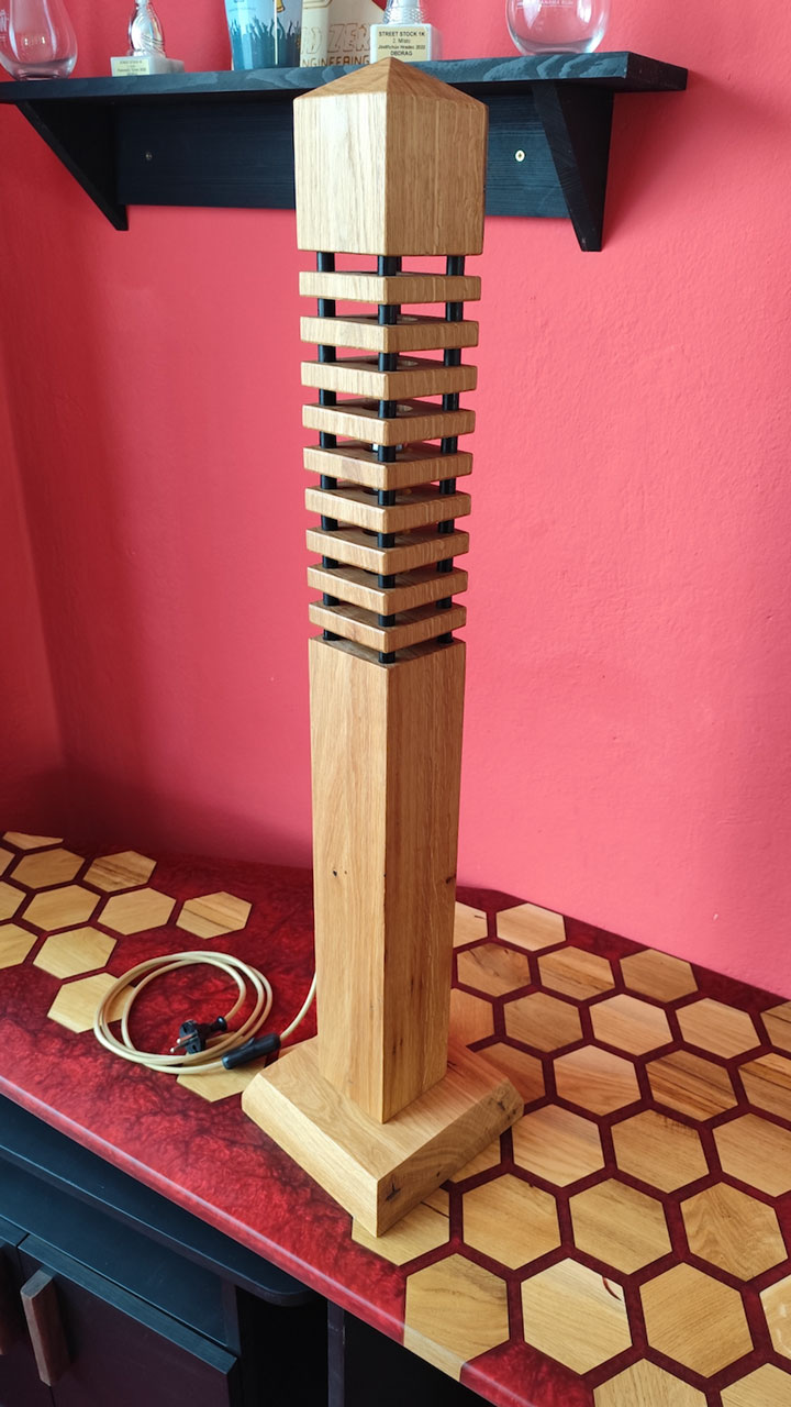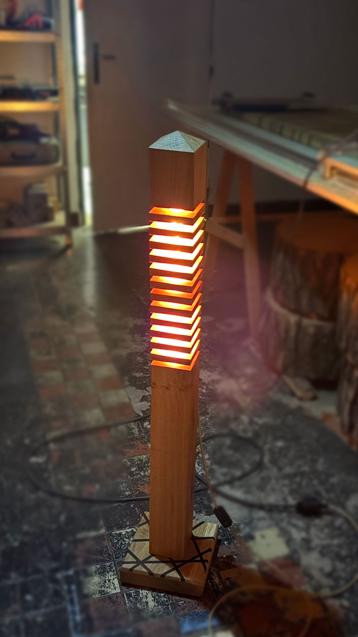 Každý „patrový“ segment lampy je samostatný blok z přírodního dřeva a epoxidu, precizně vrstvený tak, aby tvořil harmonickou vertikálu. Lampa vytváří efekt živé věže – světelná linka prochází její strukturou a mění intenzitu podle úhlu pohledu.